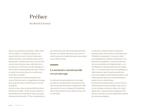 Nous nous sommes rencontrés, Olivier Varin et moi-même, à la Table du Valrose, res- taurant dont je suis le chef et le directeur. Ce e rencontre s’est produite autour de la proposition culinaire que nous lui avons fait vivre et des émotions que ce e dernière a suscité en lui. De là est né notre dialogue et sa fonction d’ambassadeur de notre maison, en ayant recours au bouche à oreille pour nous faire connaître.